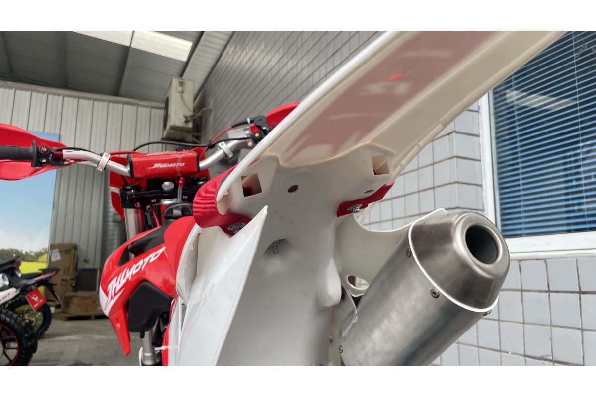 Пластик используется KTM2020 – очень прочный и распространенный, что делает его максимально возможным к обслуживанию. Руль IGP TwinWall 22/28 алюминиевый на всех моделях! Силиконовые грипсы Nibbi Racing – левая на замке, правая на короткоходной ручке газа Nibbi. Рычаги тормоза/сцепления – неломайки, из фрезерованного алюминия от CNC. Влагозащищенные кнопки старт/стоп на руле. Складной рычаг переключения передач, фрезерованный, из алюминия, от бренда PRO CAKEN. Лапка тормоза так же фрезерованная, алюминиевая. Самая легкая и прочная приводная цепь RK520MXZ уже установлена!