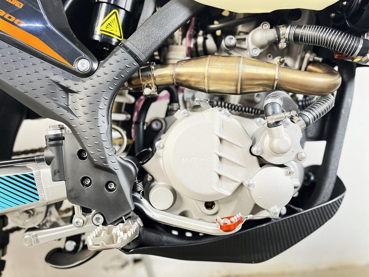 Пластик используется KTM2020 – очень прочный и распространенный, что делает его максимально возможным к обслуживанию. Руль IGP TwinWall 22/28 алюминиевый на всех моделях! Силиконовые грипсы Nibbi Racing – левая на замке, правая на короткоходной ручке газа Nibbi. Рычаги тормоза/сцепления – неломайки, из фрезерованного алюминия от CNC. Влагозащищенные кнопки старт/стоп на руле. Складной рычаг переключения передач, фрезерованный, из алюминия, от бренда PRO CAKEN. Лапка тормоза так же фрезерованная, алюминиевая. Самая легкая и прочная приводная цепь RK520MXZ уже установлена!