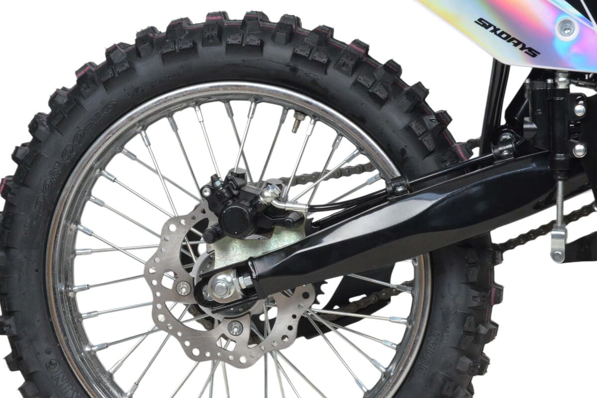 У питбайка отличный узнаваемый дизайн. Конструкция подчёркивает неуступчивый спортивный характер, который не остановится ни перед одним препятствием. Комбинированный прочный пластик не ломается при сгибании. Передняя подвеска — телескопическая вилка перевёрнутого типа (регулировка по давлению), которая отлично подходит для преодоления ям, и других неровностей плохих дорог или их отсутствия. Задняя подвеска маятниковая, моноамортизатор с прогрессией. А так же оснащён складными рычагами сцепления и переднего тормоза.