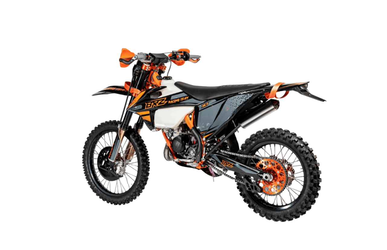 Мотоцикл BRZ X7 идеально себя чувствует в эндуро и кантри кросс дисциплинах. Идеально зайдет после владения «воздушкой». Сочные низа дают уверенность при преодолении сложных препятствий и подъемов с переставками. С газа поднимает на заднее колесо на любой передаче! Двигатель Двигатель За основу мотоцикла взят самый популярный двигатель NC250 (ZS177FMM). В 22 году было принято решение не оснащать двигатель увеличенной поршневой, т.к. 300сс поршневая требует постоянной и сложной подстройки, перебор жиклеров и тп. 250-ка в этом отношении намного проще и стабильнее. Она также более сбалансирована и хорошо работает как на низких, так и на высоких оборотах. Карбюратор В паре с двигателем установлен карбюратор NIBBI PWK 34, надежный и неприхотливый в эксплуатации. Выхлопная система Для реализации всего потенциала двигателя на BRZ X6 применена тюнингованная выхлопная система. Увеличили длину, диаметр выхлопной трубы. Увеличили диаметр и дизайн «груши» для лучшего подпора выхлопных газов, что дает заметный прирост на низах. Сцепление Чтобы передавать всю мощность двигателя на трансмиссию была доработана система сцепления.
