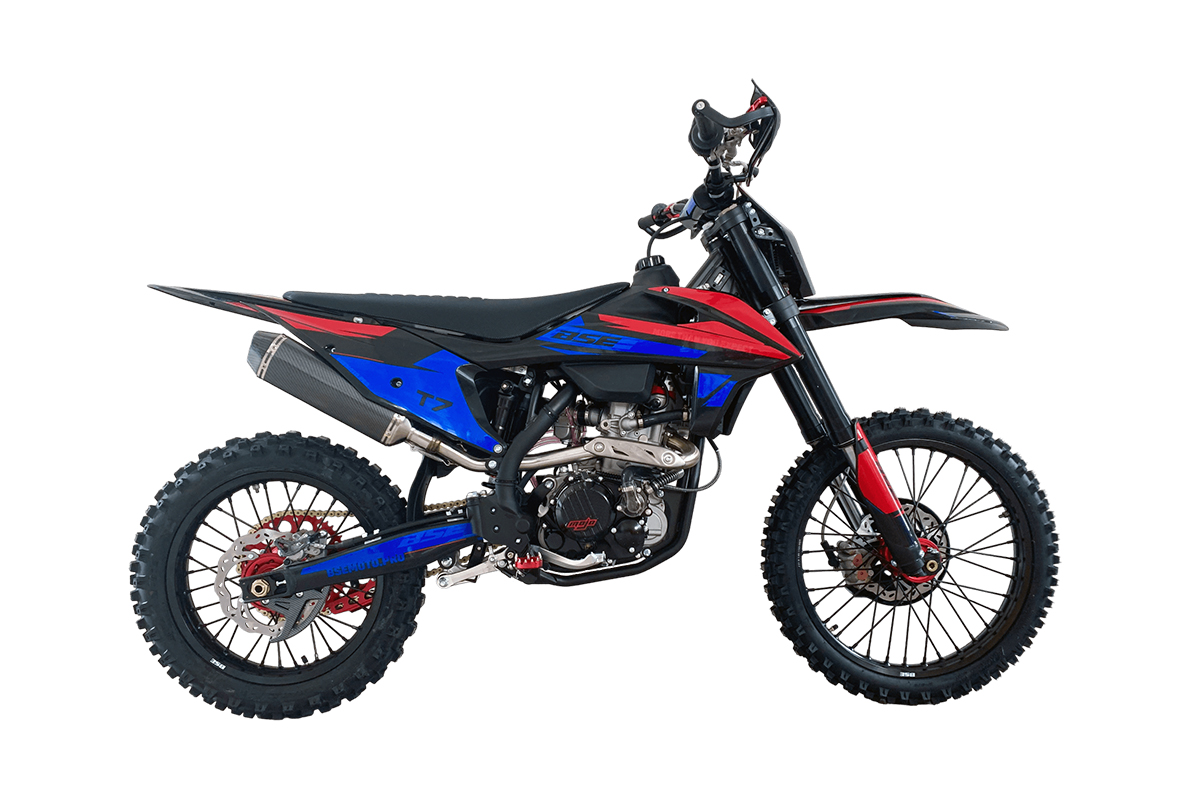 Ещё одна особенность модели Т7 – стальная рама, которая полностью соответствует всем стандартам самого известного австрийского бренда мотоциклов для кросса и эндуро – KTM. Единая геометрия, эргономика, пропорции и углы вылета вилки. Высококачественная сталь, малый вес и большой запас прочности, идеальная развесовка. Мотоцикл оснащен легким алюминиевым подрамником, системой прогрессии и пластиковой защитой мотора. Установлен новый тип пластика, прочный, легкий и современный.