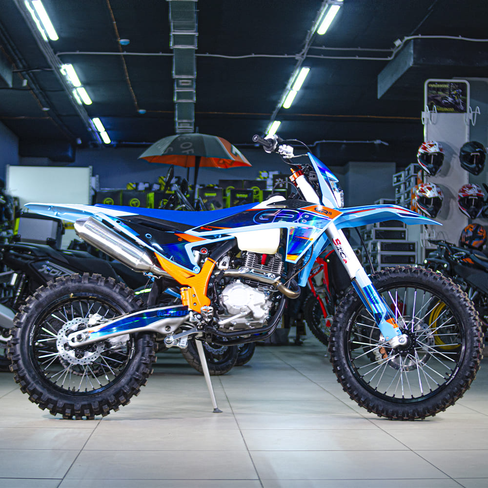 Мотоцикл GR8 F300A (4T CB300) Enduro Lite 2024 модельного года – идеальный снаряд для внедорожного экстрима. Это оптимальный баланс производительности и технической оснащённости. Модель обладает высокими характеристиками, которые позволяют справляться с непростыми условиями маршрутов как на кроссовых трассах, так и в хард эндуро. Обновлённая модификация 2024 года вобрала весь опыт инженеров компании прошлых лет, а также самые последние наработки GR. Мотоцикл стал более производительным, комфортным и привлекательным.