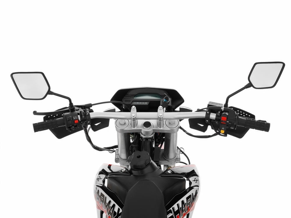 Управление байком всегда под контролем благодаря эргономичному рулю переменного сечения из ударостойкого и прочного алюминиевого сплава 7015. Мягкие силиконовые грипсы руля, короткоходная ручка газа, легкий выжим сцепления, фара с регулировкой наклона и LED-лампой. Все эти опции позволят комфортно использовать байк как в любительских, так и в серьёзных эндуро и кросс выездах. Благодаря колесам из высокопрочного алюминия 7116 с нержавеющими спицами и фрезерованными ступицами, можно преодолевать каменистые препятствия, не опасаясь повреждения обода.