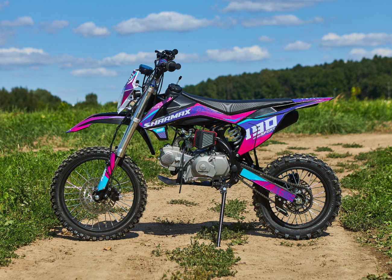 Удлиненная колесная база 1220 мм увеличивает устойчивость питбайка и позволяет гонщику комфортно держаться даже на раскисших от дождя дорогах. Диаметр колёс составляет 17/14 дюймов.