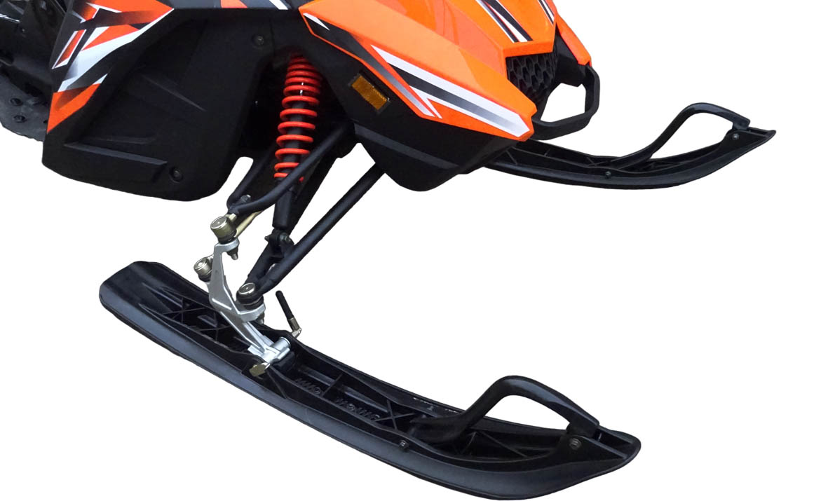 Армированная гусеница снегохода обладает хорошим сцеплением со снегом и обеспечивает безопасность райдеру. Кроме того, она позволяет устройству преодолевать подъемы с уклоном до 20°. На снегоходе установлена: передняя подвеска — рычажная с амортизатором.