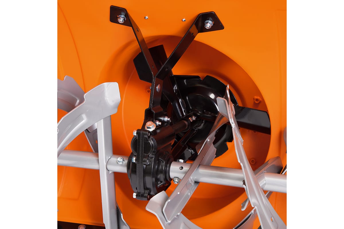 - Металлический желоб для выброса снега. Находится в удобном месте, позволяет перенаправлять выброс снега до 190 градусов с помощью рычага.