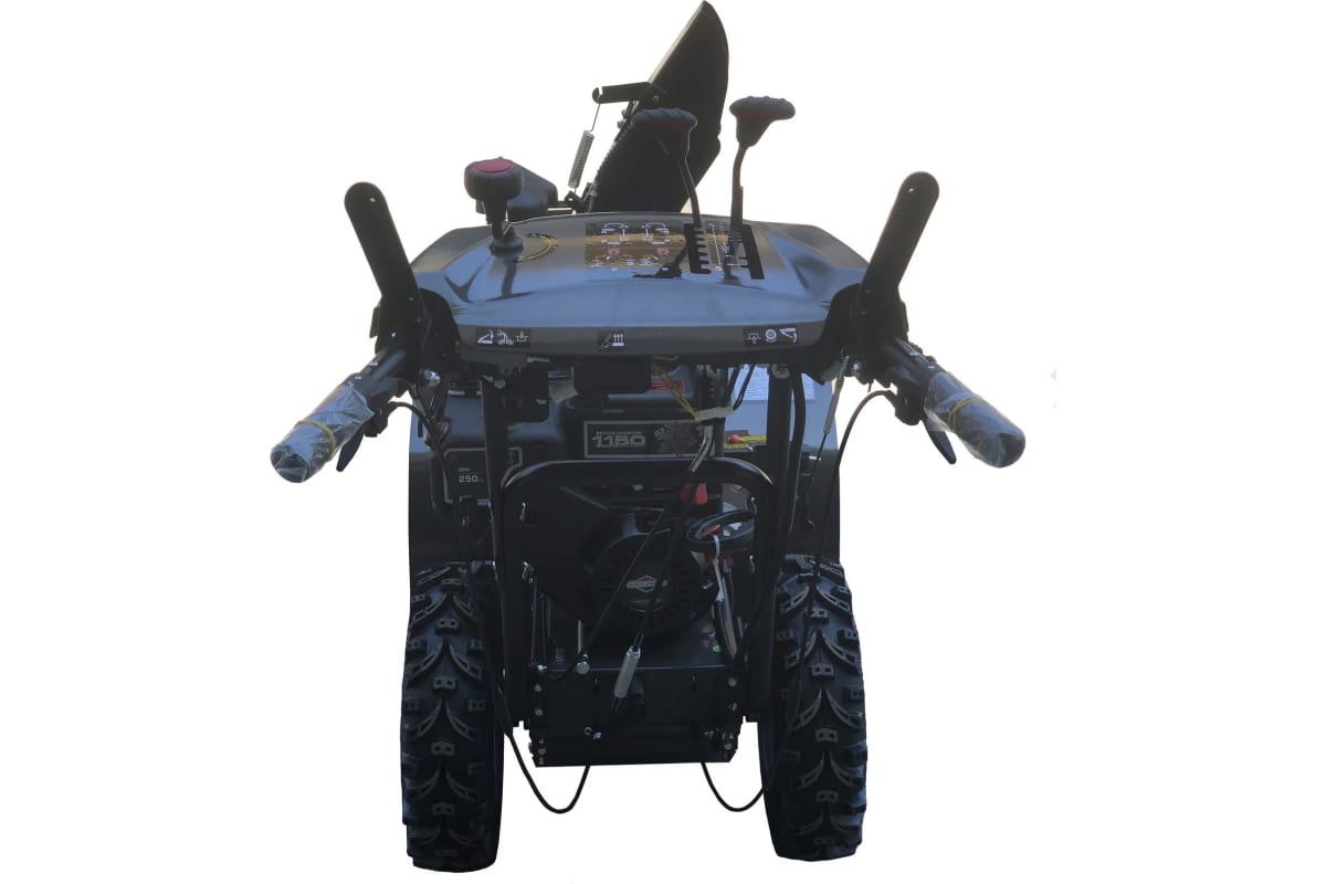 Дополнительные функции включают рукоятки с подогревом для комфортной работы в холоде и фару для освещения рабочей зоны. Отключение блокировки дифференциала улучшает проходимость на неровных и скользких поверхностях. Вес снегоуборщика составляет 110 кг, что обеспечивает стабильность и устойчивость.