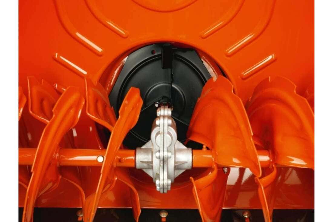 Двухступенчатая система. Снег подается под кожух шнеком и затем выбрасывается крыльчаткой через раструб.