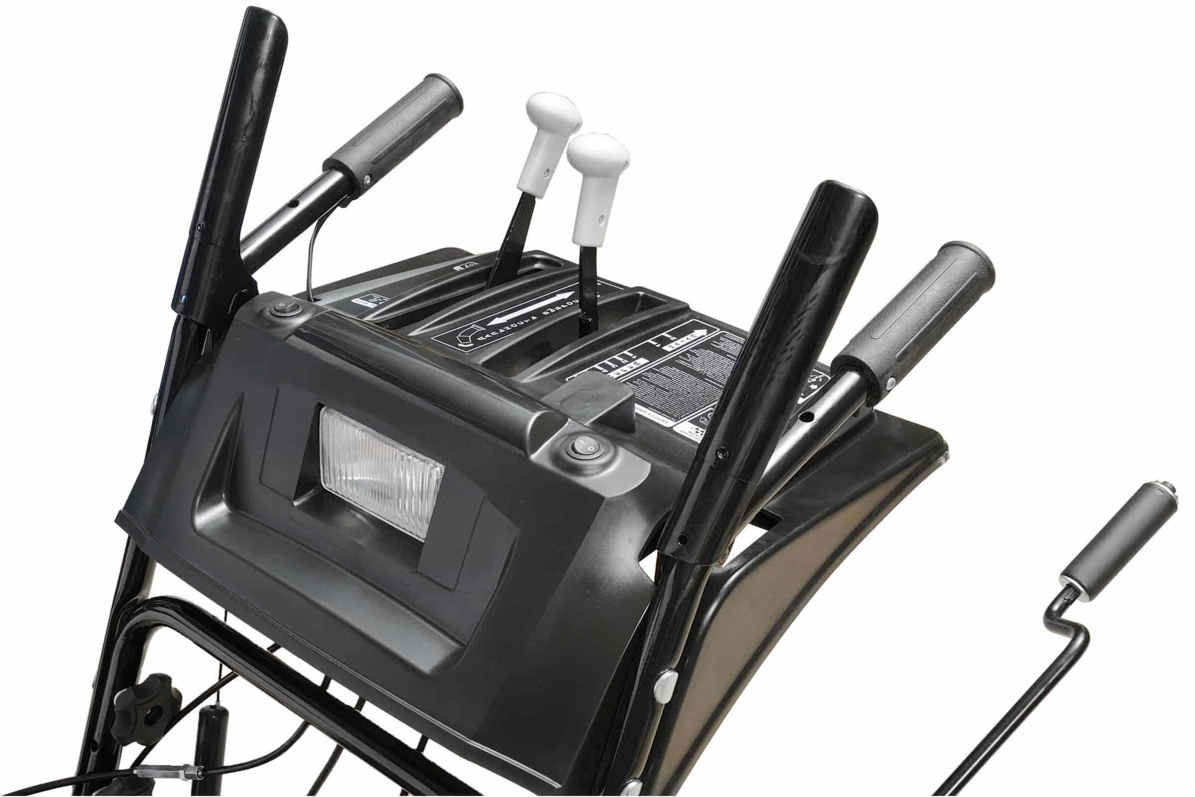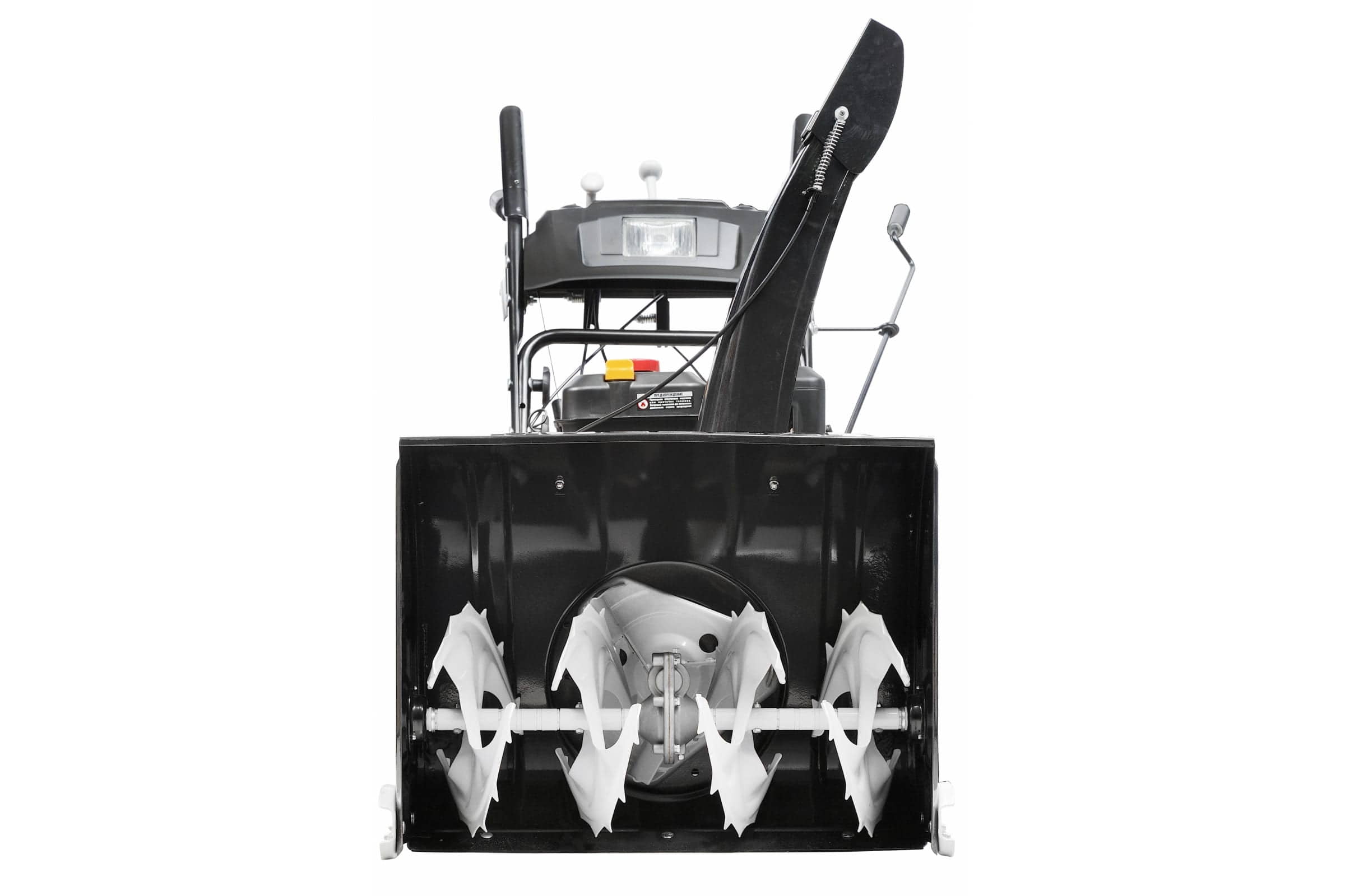 Эта модель снегоуборочной техники демонстрирует эффективность при работе с плотным и свежим снегом. Она также оснащена специальными рычагами на панели управления, которые позволяют регулировать высоту и направление выброса снега. Основные преимущества модели: