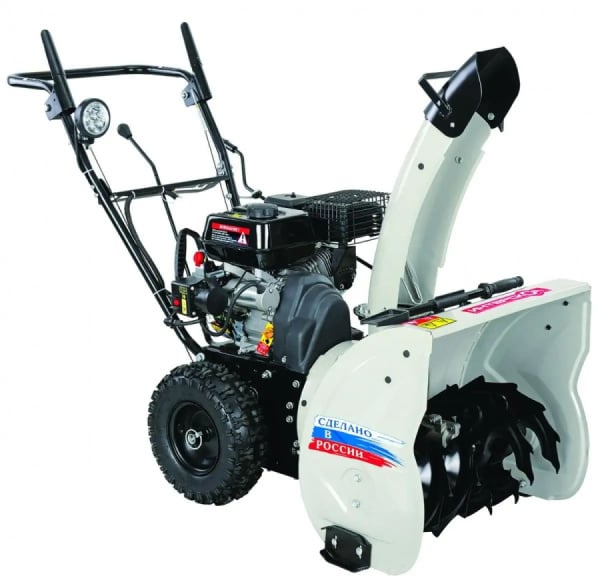 - ● двухступенчатая система выброса: снег подается шнеком и выбрасывается крыльчаткой;