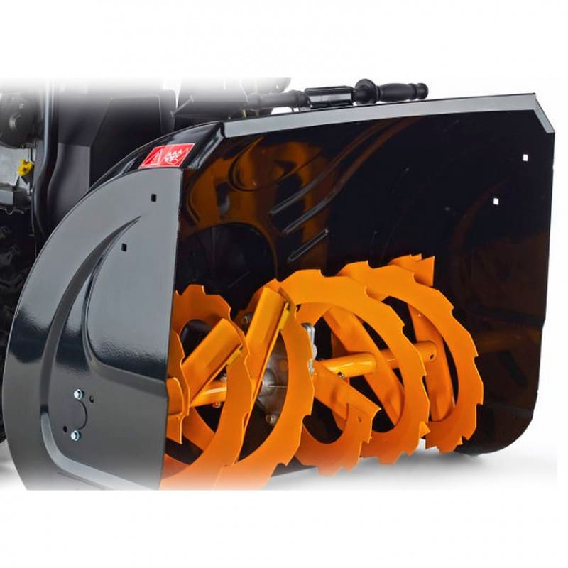 - ● поворот желоба с помощью рычага позволяет выбрасывать снег в любую сторону;