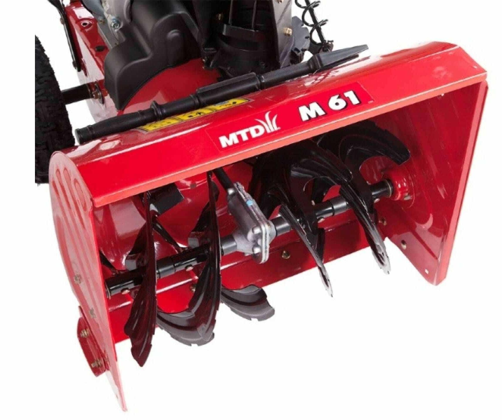 Снегоуборщик MTD M61 - отличная и недорогая снегоуборочная машина. Оснащена приводом на колеса со специальными покрышками, протектор которых не позволяет скользить даже на льду. Колёсный снегоуборщик MTD M61 лёгок и прост в управлении, имеет стильный дизайн. Оснащается прочным пластиковым желобом для выброса снега, поворачиваемым на 180°. Направление и дальность выброса снега устанавливается вручную и обеспечивают точный выброс снега в любом направлении. Имеет усиленный зубчатый шнек обеспечивает наиболее эффективное измельчение наледи и слежавшегося снега. Шнек аккуратно захватывает снег, счищая его с асфальта или мощеной дорожки. Модель самоходная: 5 передних скоростей и 2 задние. Снегоуборщик mtd 61 имеет крупные элементы управления, которыми легко оперировать даже в перчатках. Управление приводом на колеса и приводом шнека находятся на правой и левой рукоятке соответственно.