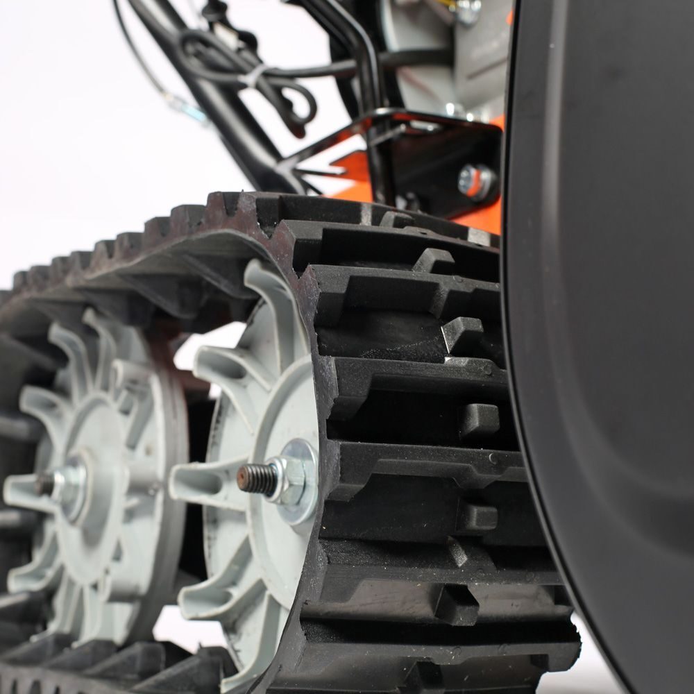 - ● двухступенчатая система выброса и зазубренный шнек легко справляются с уборкой любого типа снега;