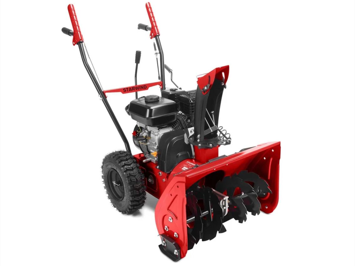 Starwind GST-4356-бензиновый самоходный снегоуборщик с четырёхтактным воздушно-охлаждаемым двигателем. Чугунный шнек аккуратно срезает и подаёт снег к крыльчатке, которая выбрасывает его через поворотный желоб с плавной регулировкой направления. Самоходный привод на колёса облегчает манёврирование, а агрессивный протектор обеспечивает сцепление на скользких и рыхлых поверхностях. Эргономичная рукоятка с удобным доступом к органам управления, простая система запуска и лёгкий доступ к фильтрам делают эксплуатацию комфортной. Прочная рама и металлические элементы шнека гарантируют надёжность при регулярной интенсивной работе.