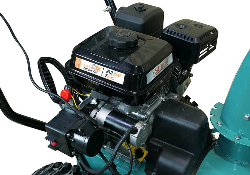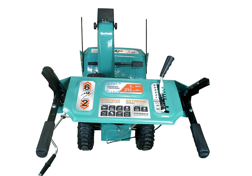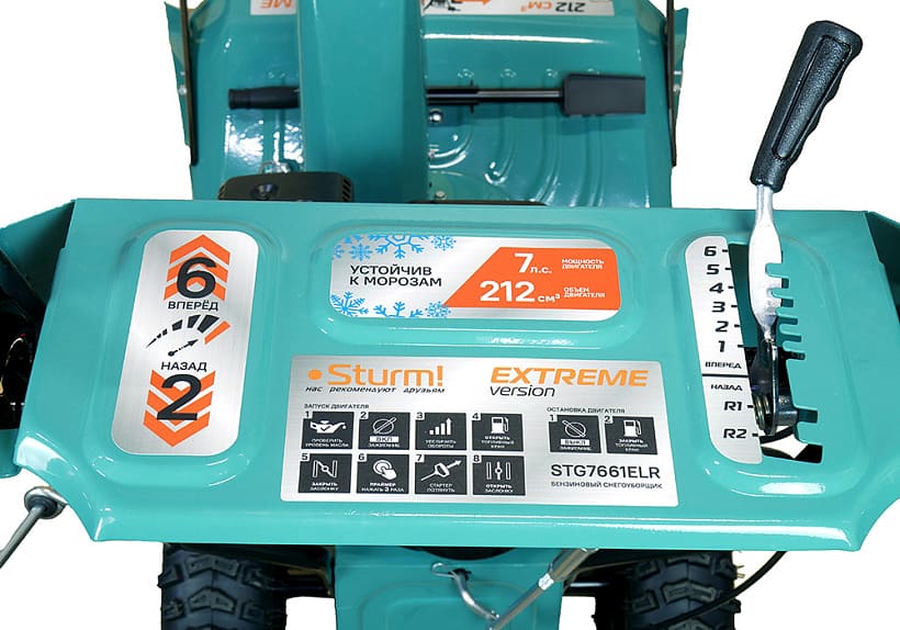 Бензиновый снегоуборщик Sturm! STG7661ELR — это самоходная двухступенчатая снегоуборочная машина, оснащенная зимним вариантом надежного четырехтактного бензинового двигателя модели 170F. Система управления двигателем обеспечивает его работу в оптимальном диапазоне максимального крутящего момента, что даёт хорошую энерговооружённость для выполнения тяжёлых работ. «Сухая» гильза цилиндра двигателя из высокопрочного материала обеспечивает долговечность цилиндропоршневой группы. Зазубренный шнек первой ступени успешно измельчает слежавшийся снег и может справиться даже с настом толщиной до 2 см. Высокооборотистая вторая ступень снегоуборочного агрегата отбрасывает снег на расстояние до 12 м. Широкие колеса с развитым анти-снежным протектором позволяют уверенно двигаться по рыхлому снегу.