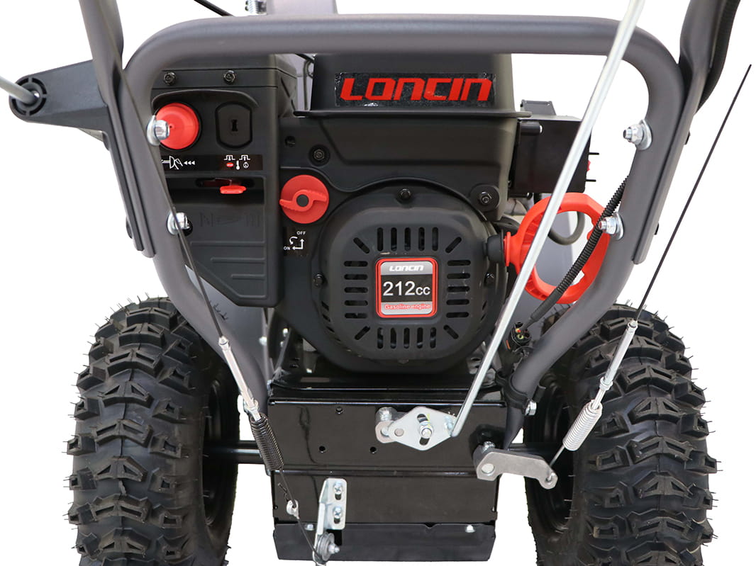 Электрический стартер, подключаемый к стандартной электросети 220В, гарантирует легкий запуск двигателя при низких температурах. Не может быть ничего проще – просто подключите удлинитель к штекеру и нажмите на красную кнопку для запуска двигателя. Направление выброса можно настраивать непосредственно с места оператора. Для изменения направления Вам необходимо поворачивать ручку влево или вправо, а для изменения угла выброса - вперед или назад. Блокировка ручки управления позволяет освободить одну из рук оператора, когда необходимо переключить скорость или отрегулировать направление выброса снега без остановки снегоуборщика.